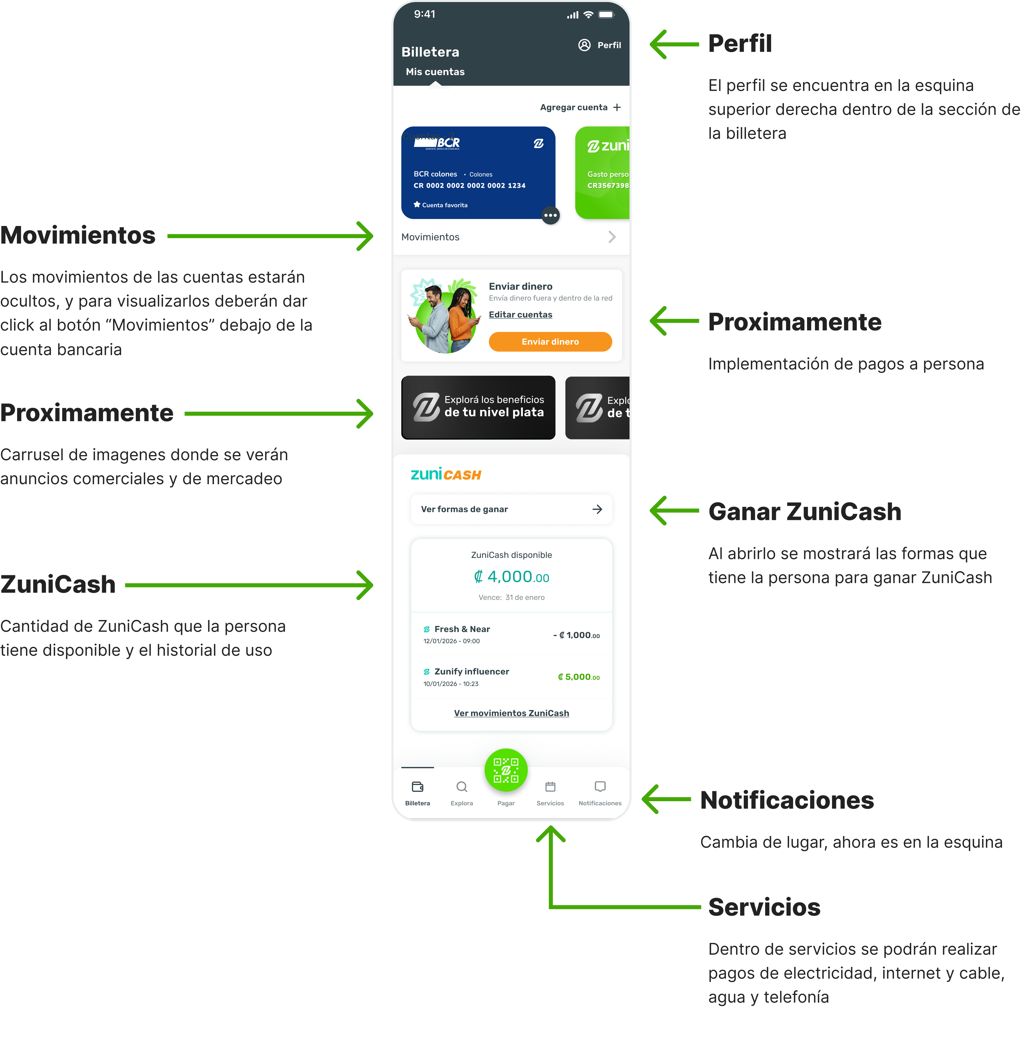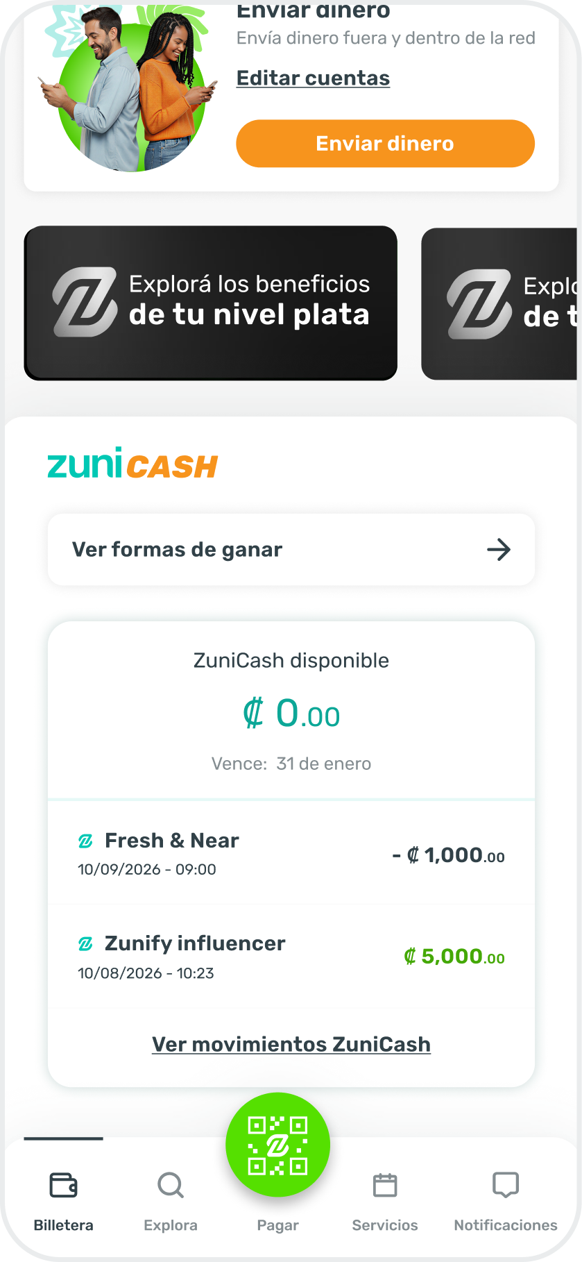 • La sección de ZuniCash seguirá estando en la billetera, pero las personas deberán hacer scroll para encontrarlo, ya que se encontrará debajo del carrusel de imagenes