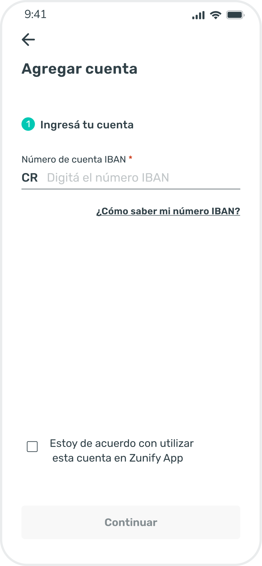 Se escribe el número IBAN propio de la persona y se da la autorización para utilizar la cuenta en Zunify App