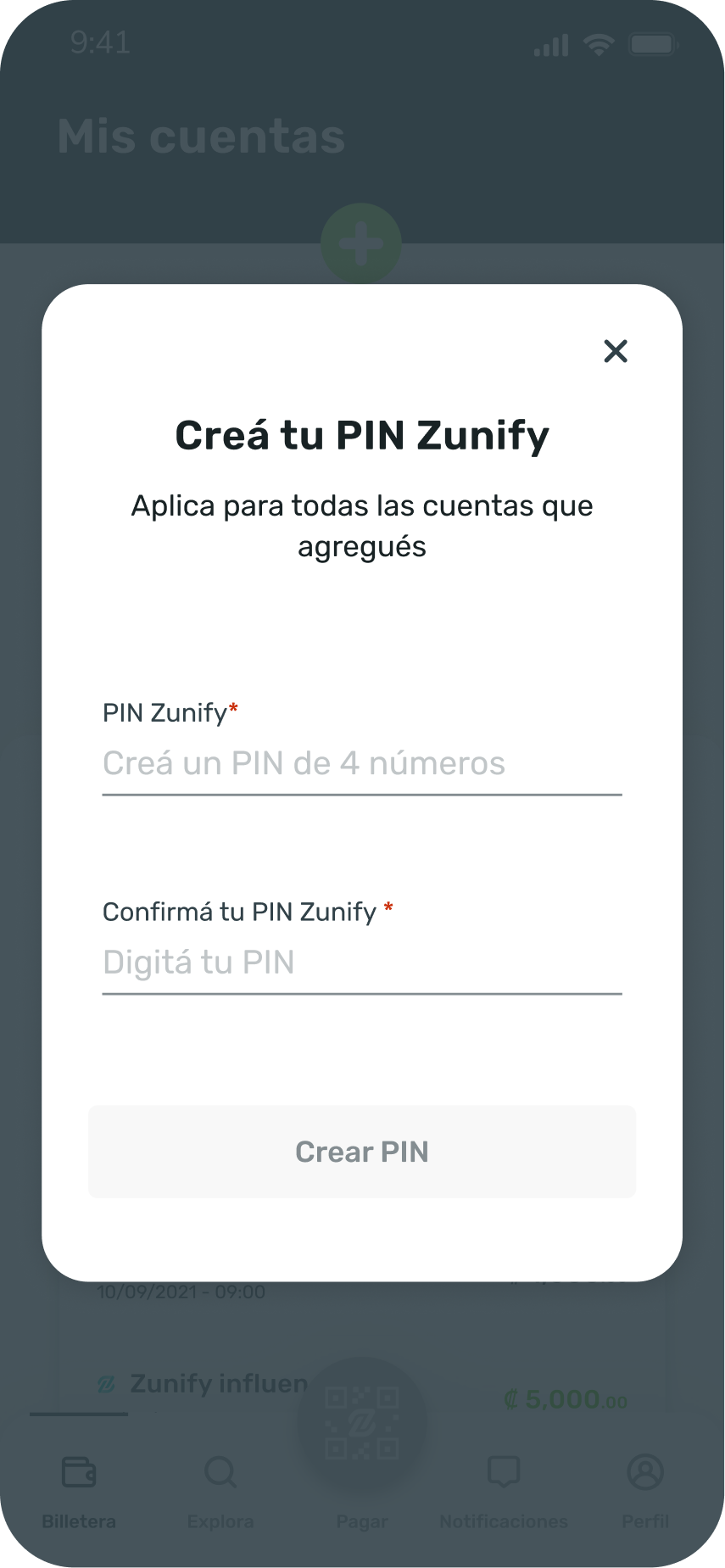 La primera vez que se agrega una cuenta, se deberá crear el PIN Zunify de 4 números cualquiera