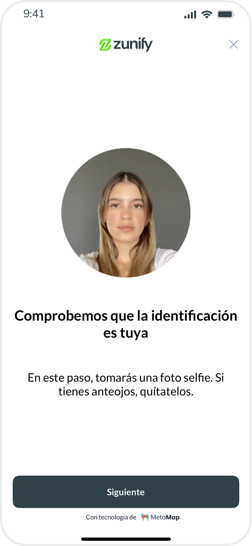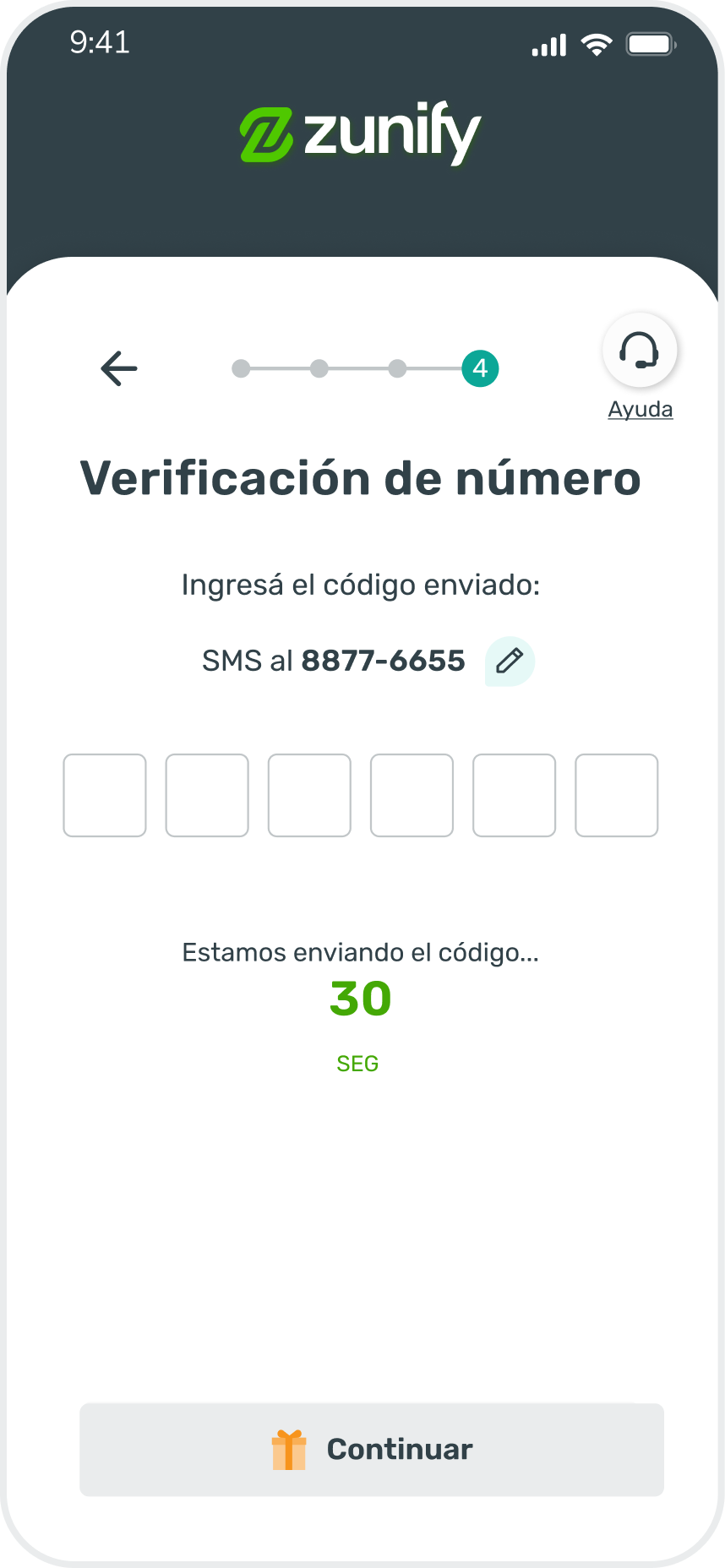 Si no llega el mensaje de texto con el código de verificación al número de celular, por favor contactar al soporte de Zunify