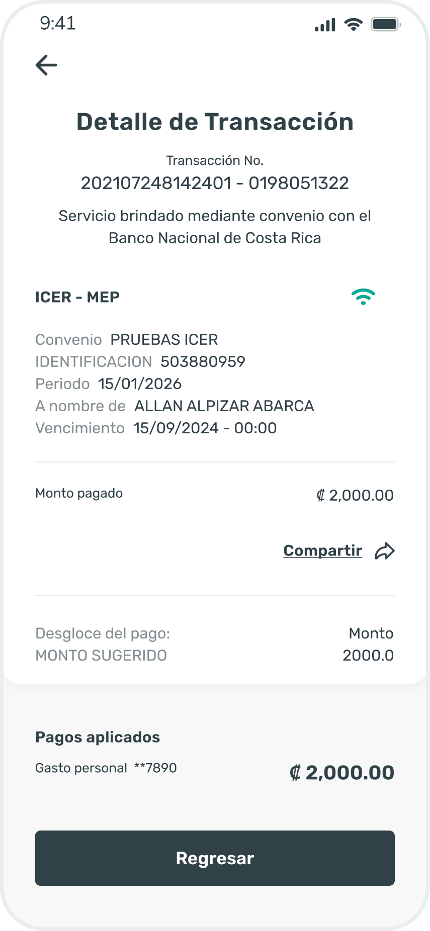 Al abrir el pago en el historial, se mostrará el detalle de la transacción