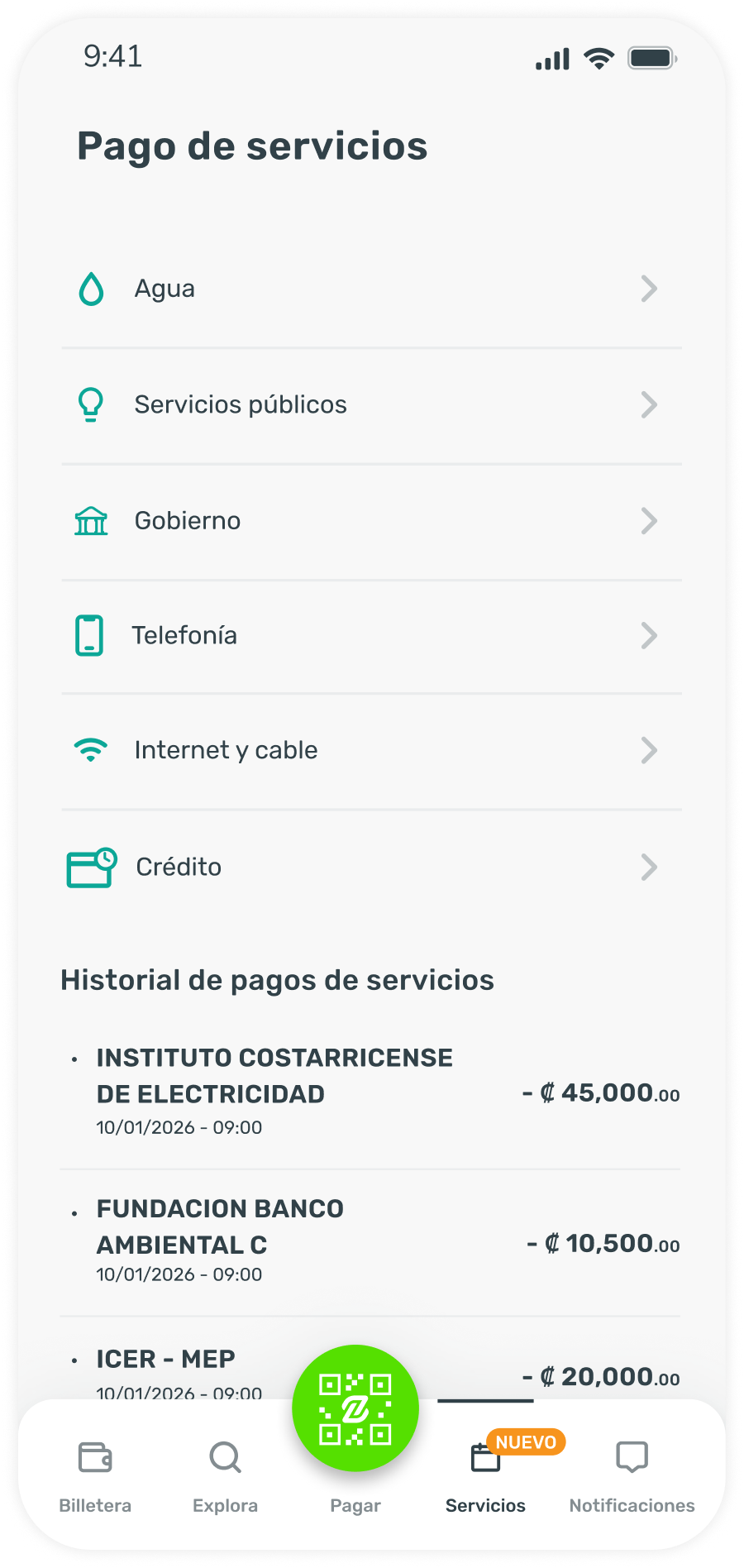 • El historial de los pagos de servicio se mostrarán UNICAMENTE en la sección de Servicios, por lo que estas transacciones NO se mostrarán en los movimientos recientes de la cuenta en la sección Billetera
